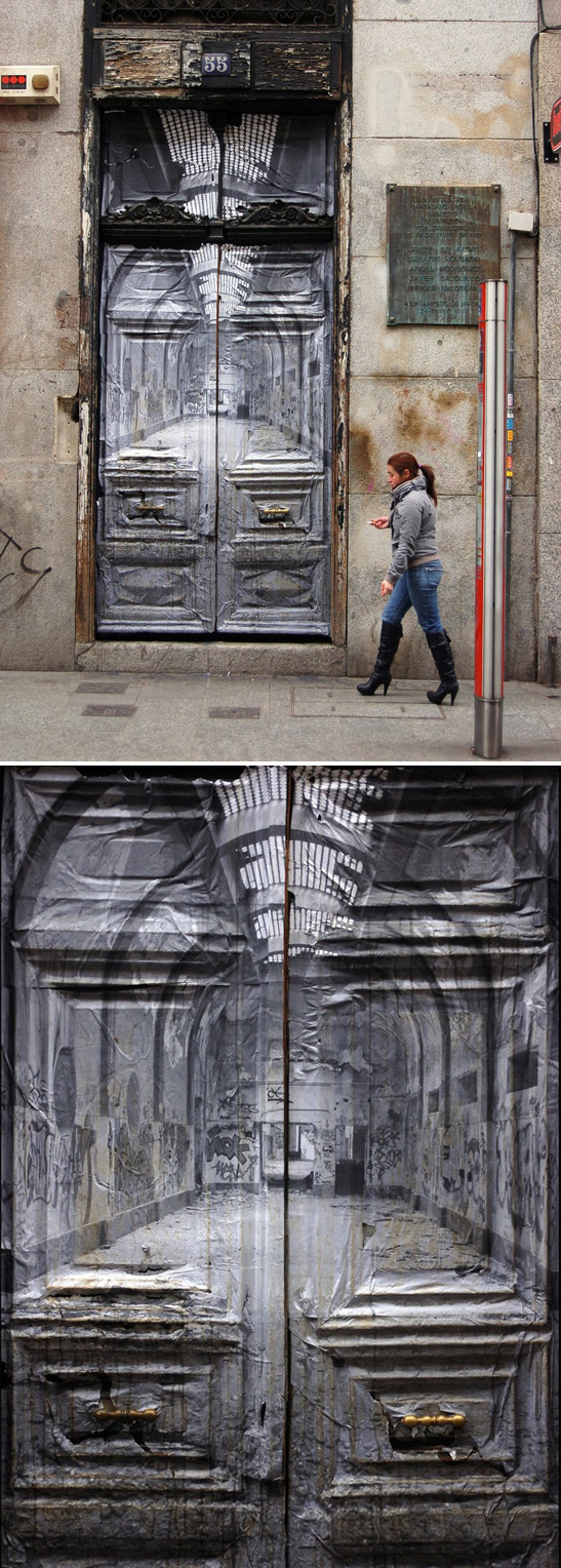 From Madrid, street artist Alberto de Pedro pasted a large photo of a detailed, decrepit interior on a detailed, decrepit door. Cool effect. via Colossal