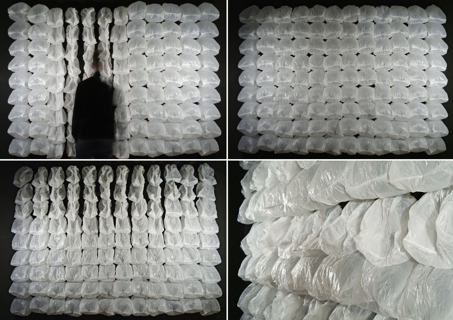 “One Hundred and Eight is an interactive wall-mounted installation mainly made out of ordinary garbage bags. Controlled by a microcontroller each of them is selectively inflated and deflated in turn by two cooling fans.