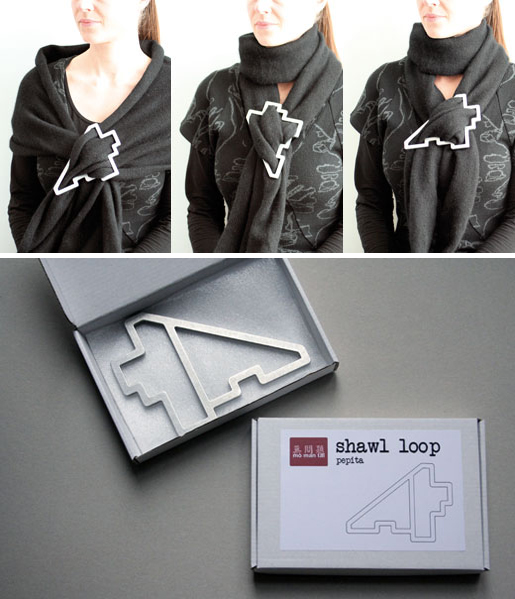 I like the idea of jewelry for your scarf. These loops (this one is the Pepita Loop) were designed by Momantai in the Netherlands. Available through their site.