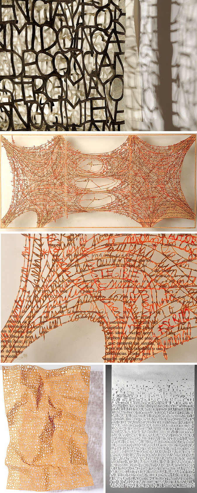 Argentinean artist Pablo Lehmann lives and works in Buenos Aires. His paper cutouts, of type and shapes cut out from large sheets of paper or cloth, are extremely intricate and impressive. In many cases he uses multiple sheets/layers to create 3D installations that seem to also play with their shadows. Lovely.