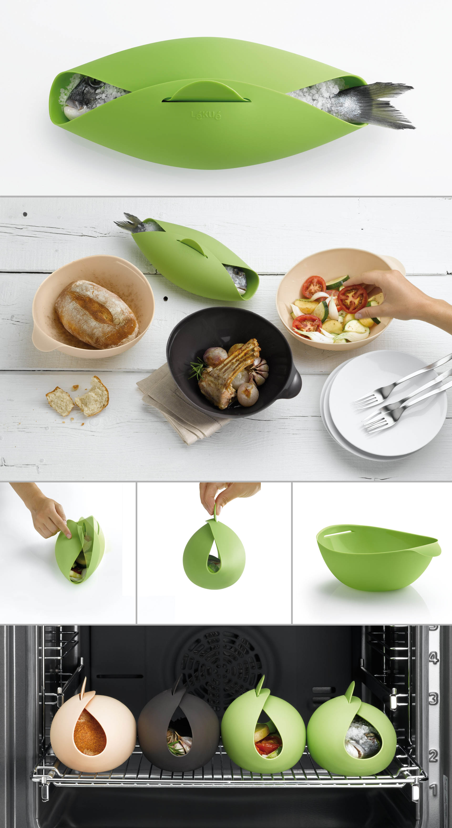 The Lekue Steam Roaster designed by Compeixalaigua Design Studio of Barcelona “is a multifunctional bowl; it takes advantage of silicone’s flexibility to change its shape. In a closed position it combines the advantages of steam cooking with a crunchy finishing produced by the air circulation from its opened ends. When opened it is merely a bowl, but you can prepare, weigh and mix all the ingredients and even serve straight from the oven.” Available here.