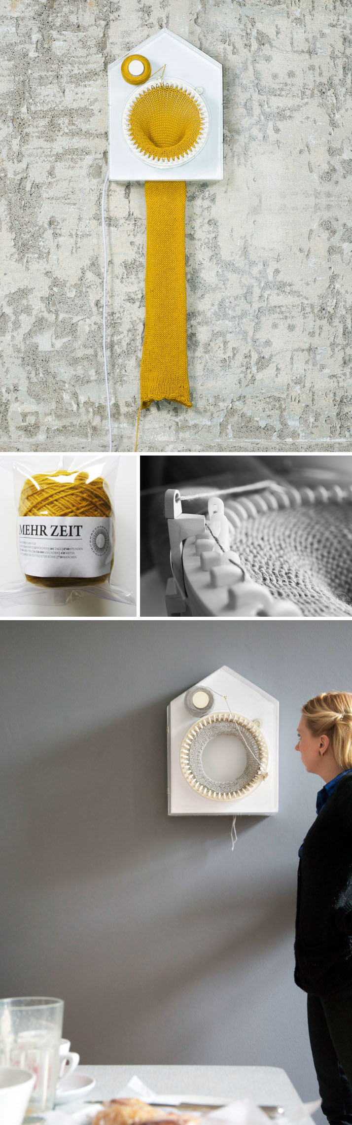 “The 365 Knitting Clock was made to measure and register time in a three-dimensional form to visualize the otherwise invisible time factor that connects us all. Instead of showing time in numbers…the knitting clock aims the philosophical point of the ongoing process of time….Every passing half hour is marked by the knitting of a mesh, a full day is registered as one round around the clock and a year results in a 2-meter long scarf…The year that has past is this year’s scarf. And the coming year is the thread still unknitted.”