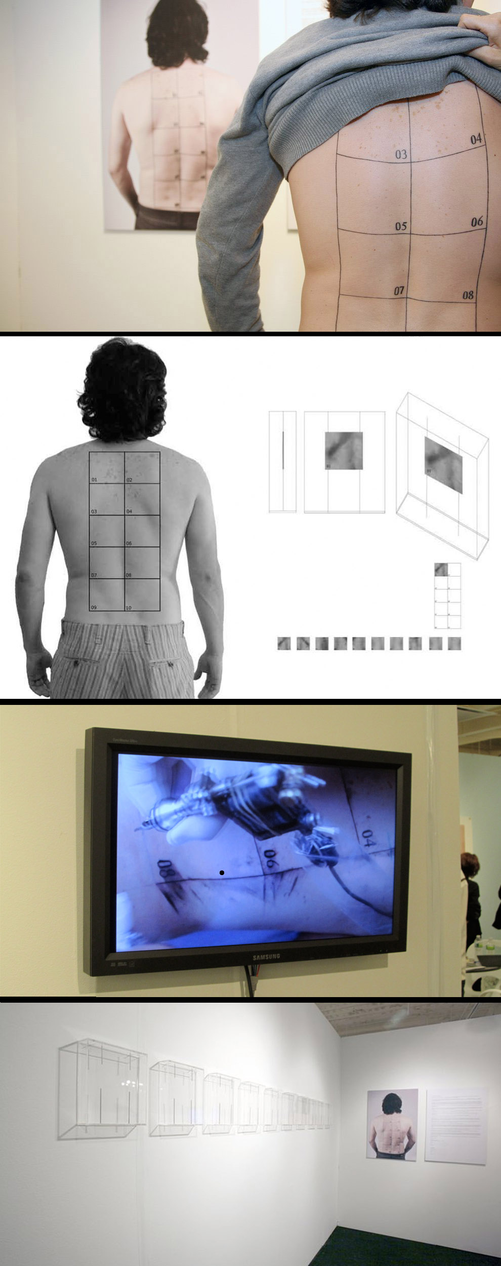 Last month at VoltaNY, one of the most unique (and possibly disturbing) exhibits was that of Costa Rican artist Mauricio Miranda. The exhibit, Plusvalía (which means “added value”) consisted of: a video showing the artist’s back being tattooed with a grid of ten boxes; a photo of the final tattooed back; and ten, empty plexiglass boxes. In the part-performance-part-conceptual piece, Miranda sells fragments of his skin (10 pieces total) to collectors who wish to acquire them. As a buyer, one receives an empty box along with a contract between the artist and buyer, which stipulates that the fragments will not be released to the purchaser until the time of Miranda’s death. This being a statement about the art market over the past years and the lack of resources for emerging artists.