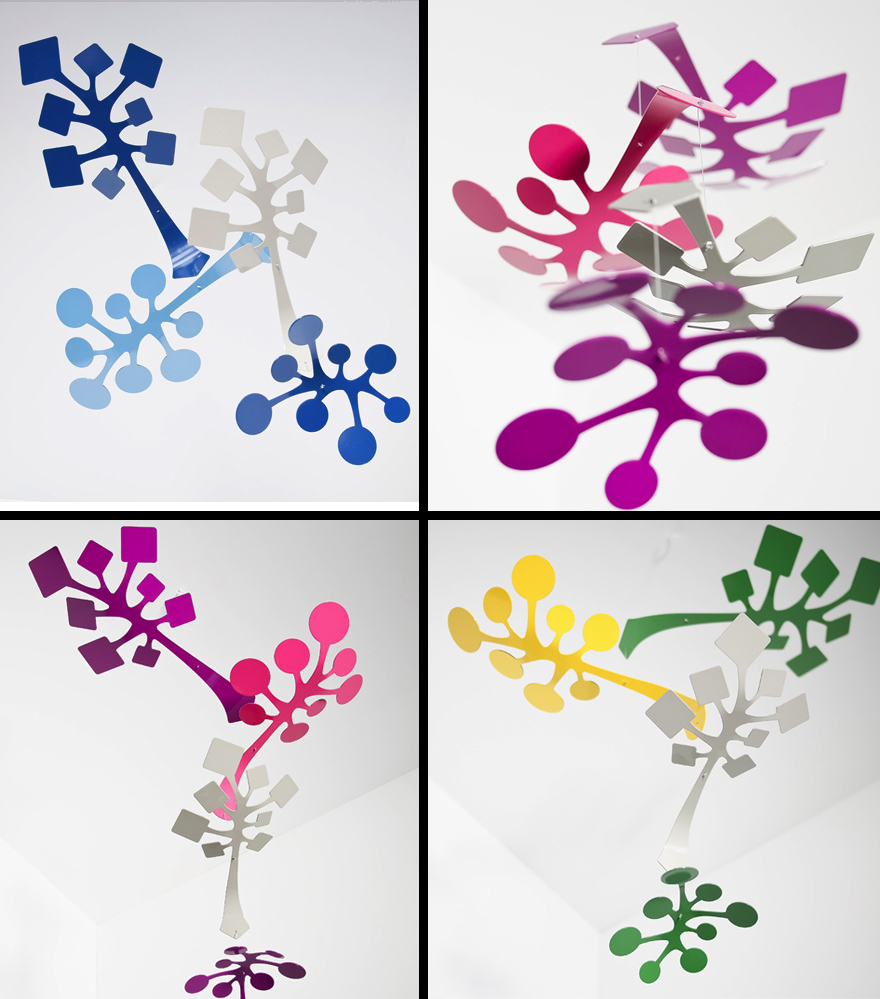 Aren’t these delightful? Designed by Brian Schmitt these mobiles “feature a playful interplay of geometric and organic forms” in a bunch of bright color options. Powder coated finish on lasercut aluminum.