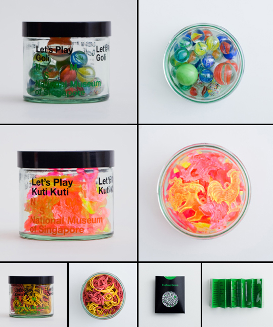 I love the packaging on these Traditional Games for the National Museum of Singapore. They almost look like little jars of candy. Each one (six total) represents a traditional game played in Singapore and comes complete with instructions tucked in a nicely designed envelope. The six games are: Saga Seeds; Goli; Zero Point; Kuti Kuti; Balloons; and Five Stones.