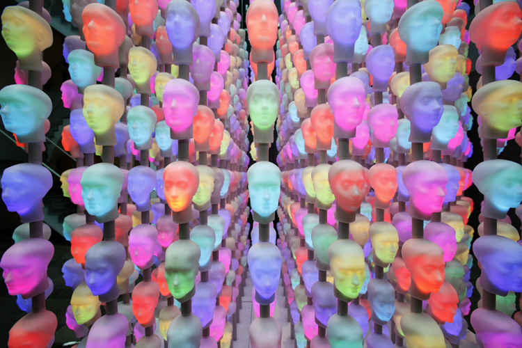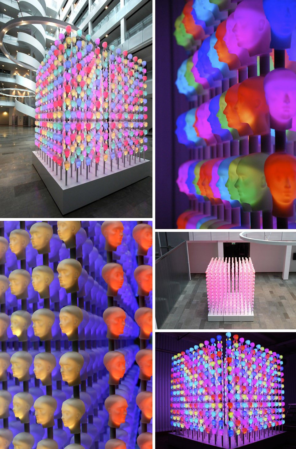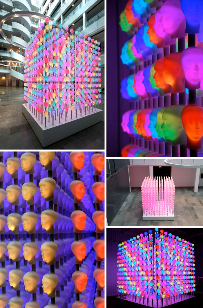 Swedish designer, Alexander Lervik, created the installation Dimensions out of 1728 heads, 35,000 parts, and 24,000 LED lamps. The cube of heads is 3-meters squared and works as a 3D screen. Originally designed for the insurance company Skandia, the light bar sculpture was displayed at this year’s Stockholm Design Week.