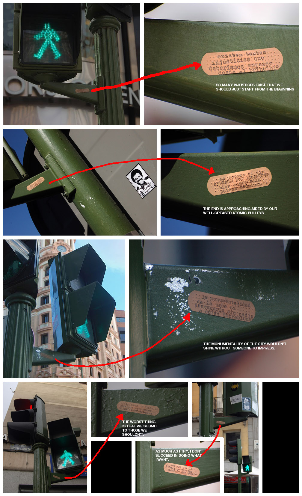 If you happen to be in Madrid and waiting for the light to change at a street corner, you might want to look up and check the closest traffic light for a Tirita Maldita (Damned Band-Aid). Popping up periodically around the Spanish capital are these, sometimes humorous/sometimes political, typed messages on band-aids; one could call them “band-aid tweets.” I like the concept, almost like having someone whisper in your ear at the light. And the thought of the artist inserting band-aids in an old typewriter to create these, well, it makes me smile.