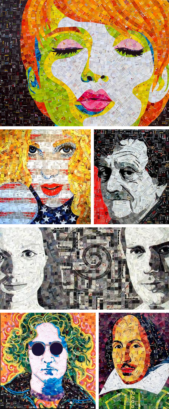 Next time you’re at the mailbox on the verge of throwing out all that junk mail, think again. Sandhi Schimmel Gold definitely does. Having studied mosaics overseas, Gold applied her knowledge to these works. By joining her disciplines of painting and mosaic with her belief in “utilizing resources that would otherwise go to waste” she has created this series of collages since 2006 which have been exhibited in shows with titles such as “Manipulated Mail” and “Recycled Art”.