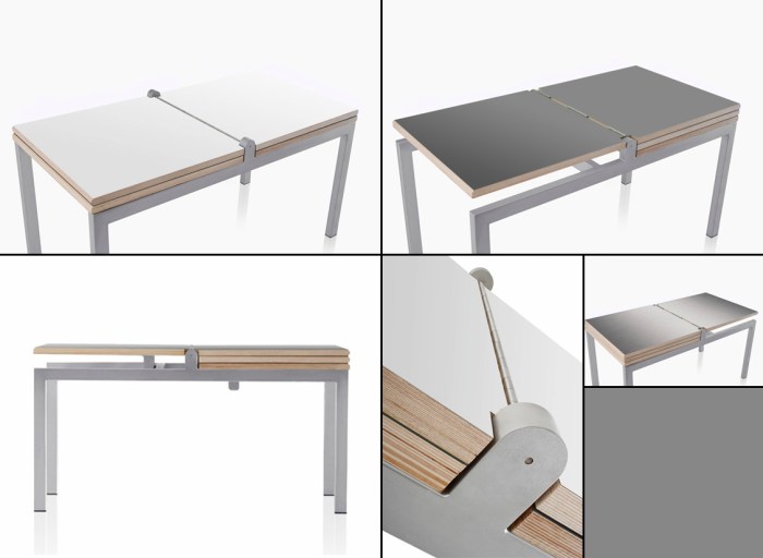 In addition to designing the Ringset ONE, the trio of young designers at Bloomming, in the Netherlands, design furniture and wall partitions. This Tablemoods table can be easily flipped to reveal a white or gray tabletop surface, depending on your mood, or I guess, that of the table’s. Made of stainless steel and birch plywood.