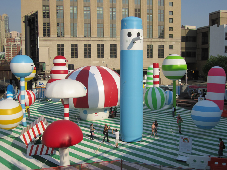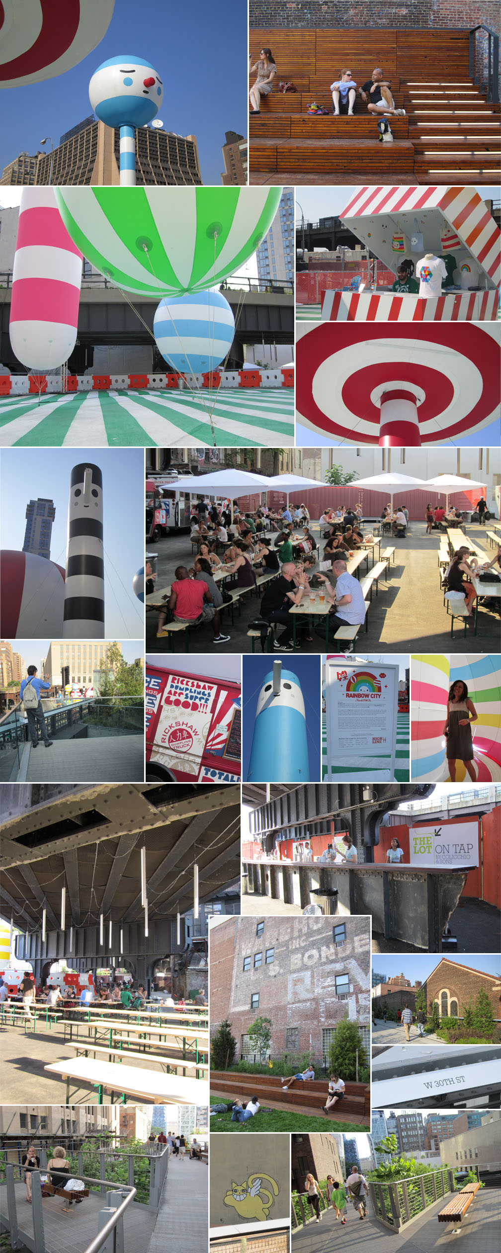 The pop-up plaza, deemed The Lot, at 30th Street and 10th Avenue is just as promised. Rainbow City, the interactive balloon installation by Friends With You is cute, fun, kid-friendly and adult-silly. It feels a little like being on a real-life Candy Land game board with a hipster twist. The food section (The Lot On Tap) with its tables nicely angled to be parallel with the High Line above it, and stylish hanging lights, food trucks, large bar and container ticket booth, is all very appealing and I can imagine will be hugely popular in the evenings and weekends.