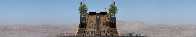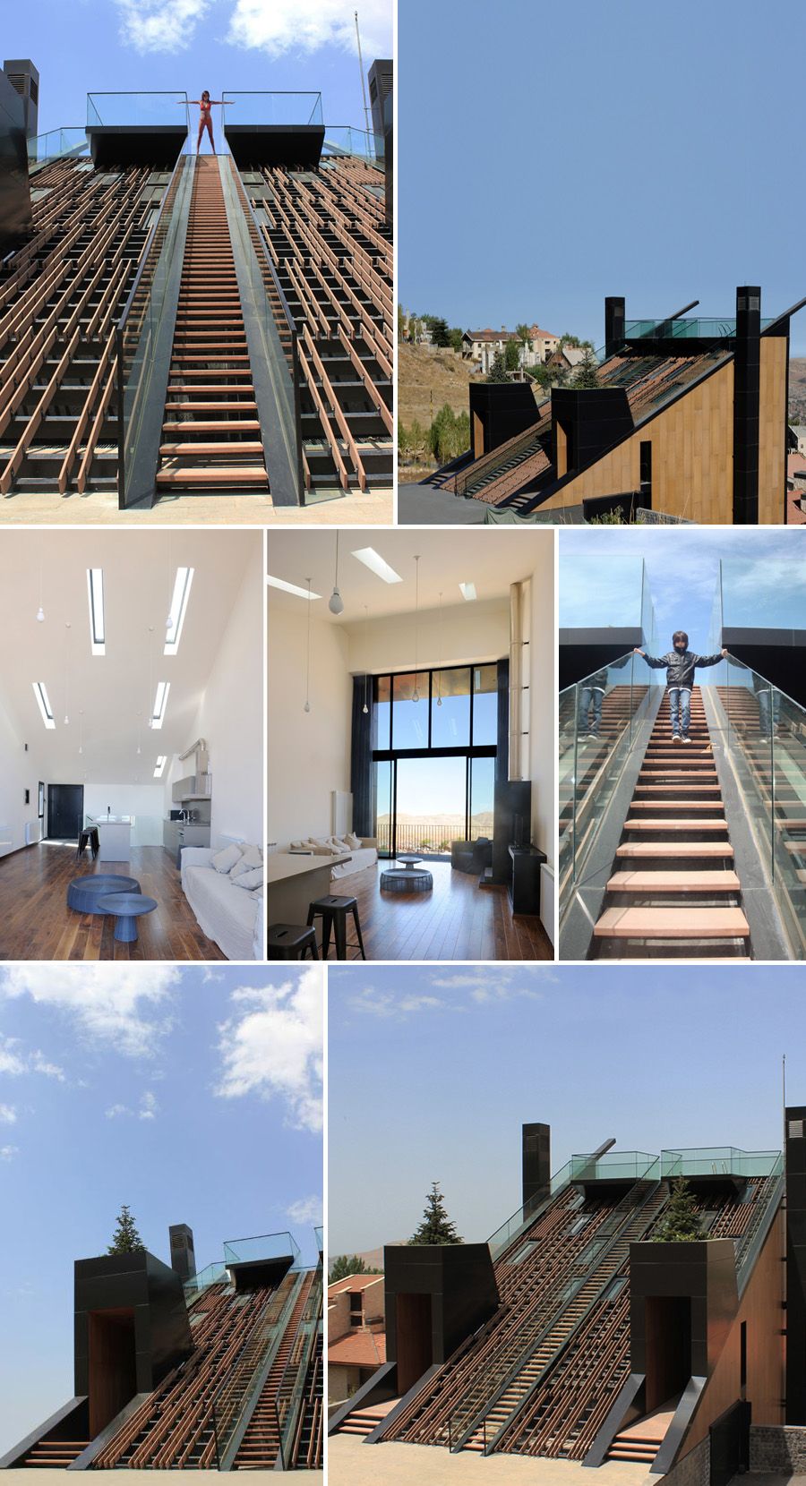 Built into a steep slope in Kfederbian, Lebanon, is a steep sloped double residence home designed by Bernard Khoury, a Beirut-based architect with many dynamic projects to his name. This residence, entitled Plot 4328, works very nicely with the topography that surrounds it. The central staircase on the southern façade (which also acts as the house’s roof) leads up to the pool which is surrounded by glass permitting a spectacular view. The two residences below are symmetrical and I like the way the skylights work into the staircased façade, creating texture to the surface and allowing light in to the individual apartments.
