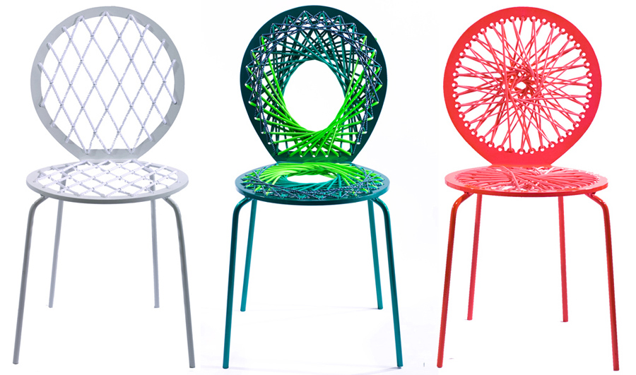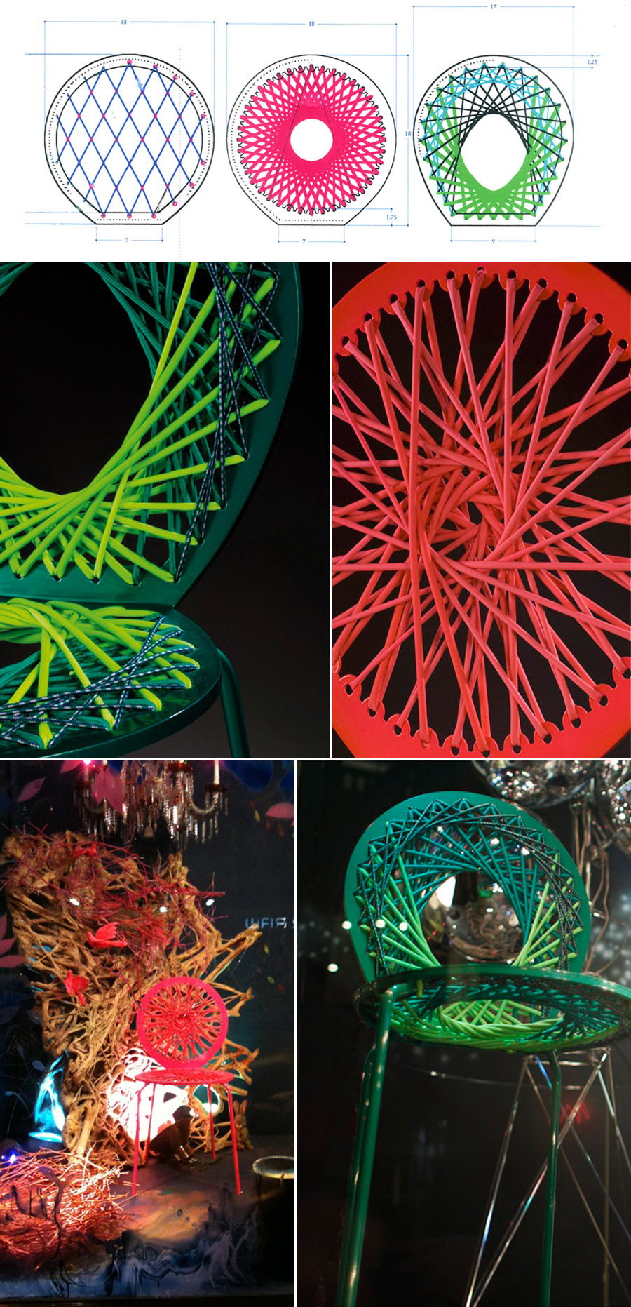 Inspired by the corset-like pieces of the fashion world, Jessica Carnevale used latex, bungee and rope to create these bright colored (our favorite is the hot pink) and fun chairs.