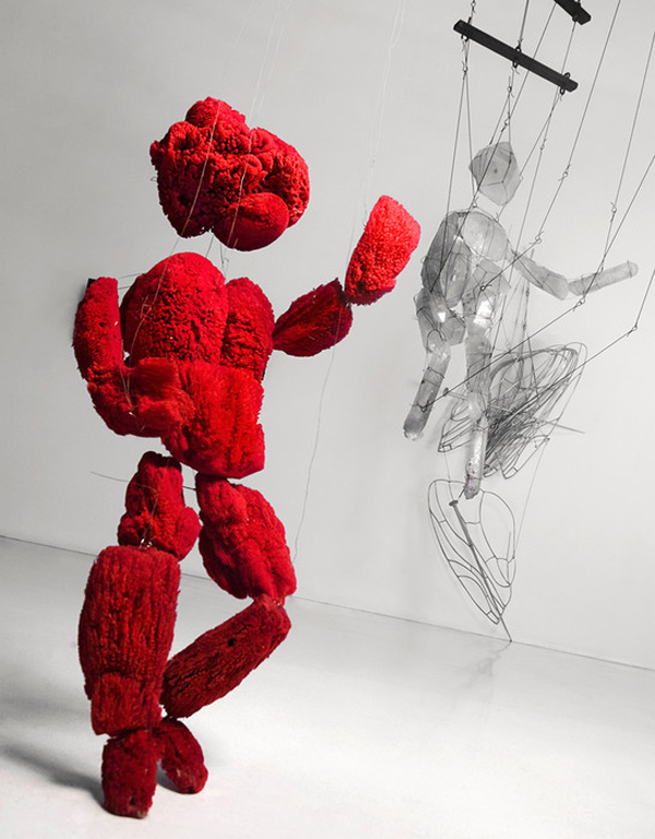 Brazilian artist Tunga, nee Antonio José de Barros Carvalho e Mello Mourao, has been creating sculptures and installations since the 1970s. Currently he has an exhibit called Presolaires at Galerie Daniel Templon in Paris. As part of the exhibit he has produced a series of marionettes made of iron, bottle glass, and crystal – materials often found in Tunga’s work – as well as pearls, sponge and amber. The puppets are offset by a collection of iron containers housing pieces of resin, silicon and steel.