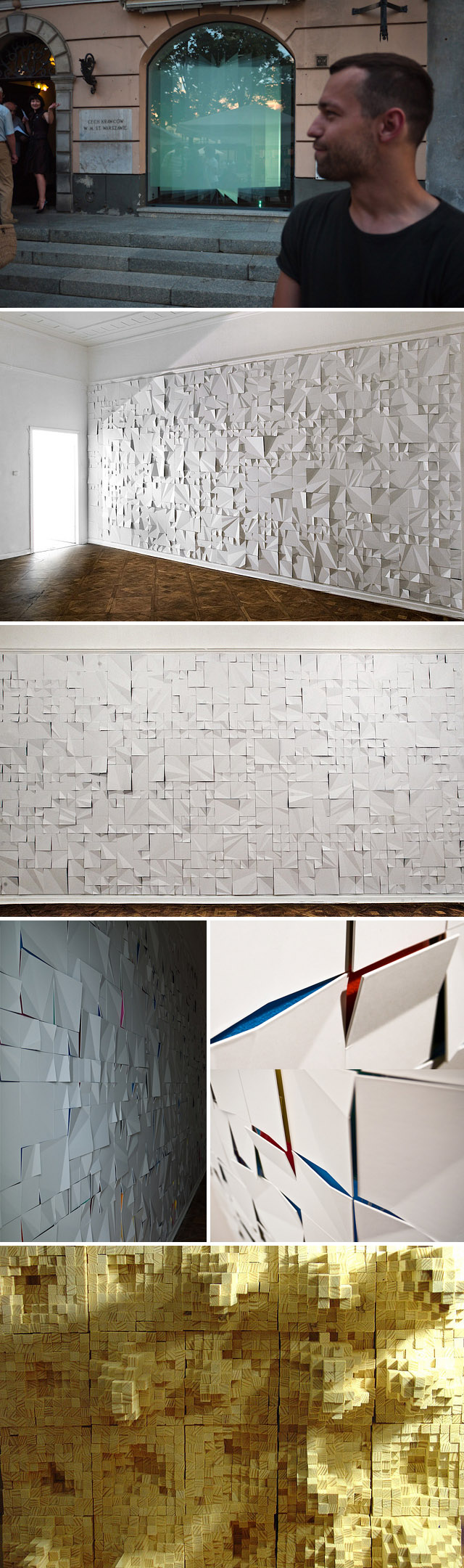 From top to bottom: We’re Going Out, Jerzy Goliszewski’s newest work made for the closing of a gallery in Warsaw. Using simple means (semi-transparent vinyl and rear projection) Goliszewski created this revolving door style, computerized-looking effect without a computer. To see it in action watch the video.The photo that follows is of the artist in front of the gallery with the artwork in the window. Kai, another installation, takes its cue from the classic fairy tale “The Snow Queen.” Kai was inspired by structures, such as the crumbling sheet of ice, the cracked ground and the cracked mirror which broke into pieces distorting the world, in the story. Next image down is from Lac Bleu 02, a wooden installation made of thousands of bits of wood and, lastly, Dynamo, another wooden installation representing force and power in its name and at the same time the block’s transparency removes the stability and exposes its fragility like a house of cards.