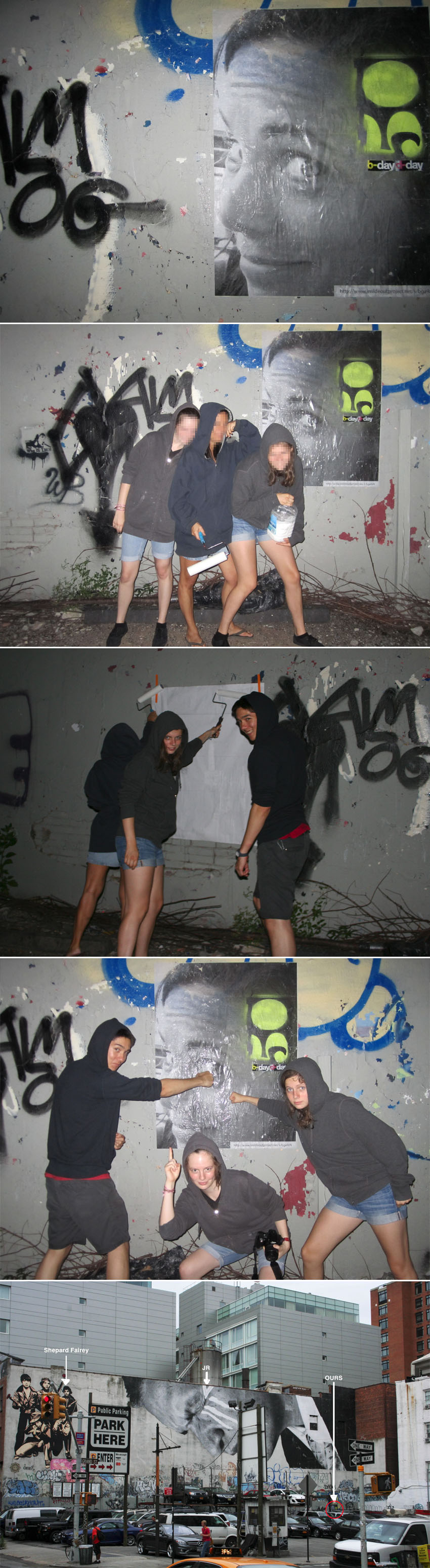 JR’s wish? To use art to turn the world inside out. His Inside Out Project is a “large-scale participatory art project that transforms messages of personal identity into pieces of artistic work.” The three of us participated in this ongoing event, with the help of our buddy Rence, and set out to post our poster under one of JR‘s massive Soho murals. As you can see above, our poster is a mere speck on the wall by comparison (click to enlarge for better view) and clearly no JR but, regardless, we had a blast putting it up and it’s great fun to be a part of this international well-meaning project.