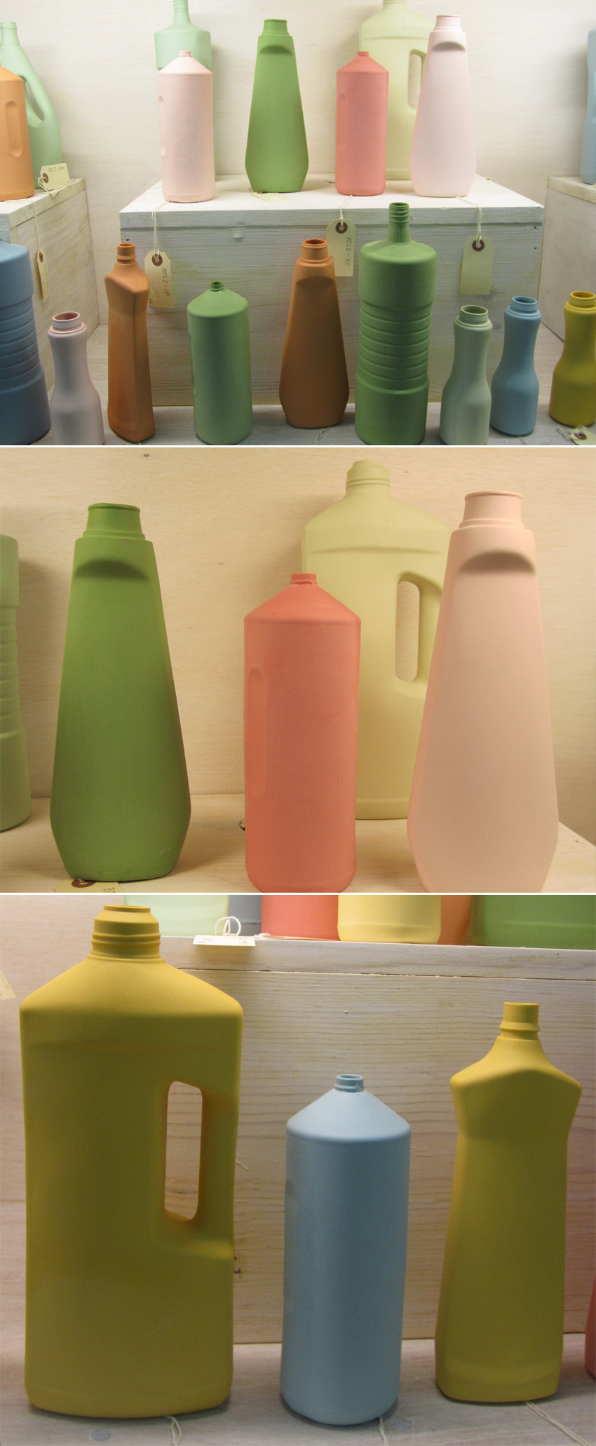 That porcelein cleaning bottle is unbelievable. Imagine, those bottle supposed to be a trash but because of art, it become a great porcelein. Nice idea!!