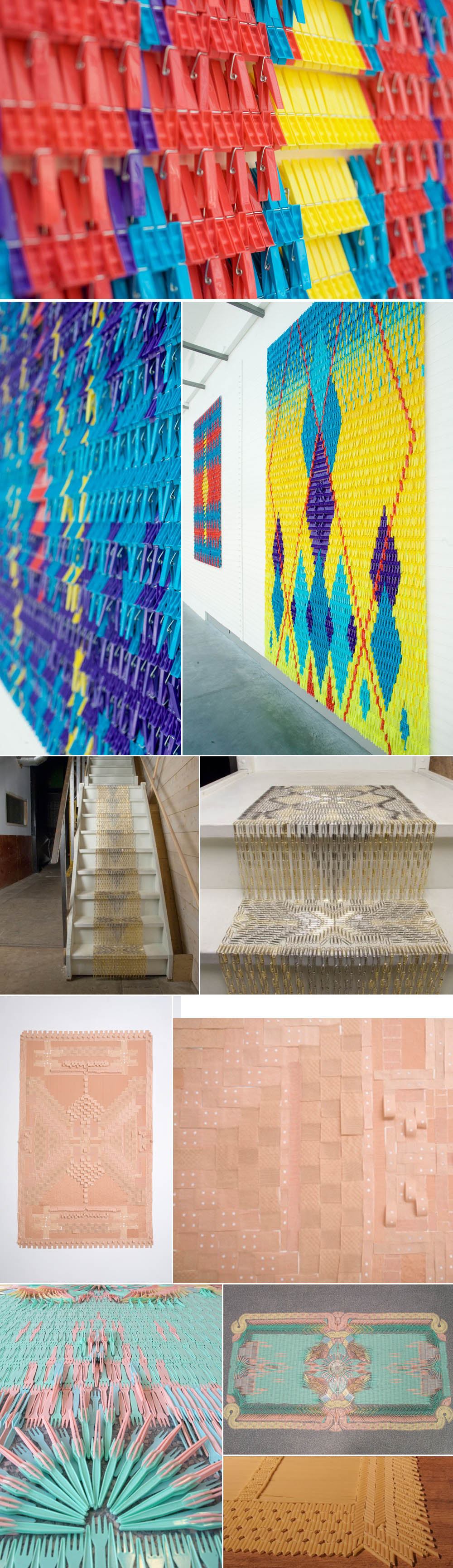 The Dutch design trio that form the collective We Make Carpets are Marcia Nolte, Stijn van der Vleuten and Bob Waardenburg. Together, they have made a series of contemporary interpretations of the centuries-old medium. Their most recent carpets are presently hanging at the Graphic Design Museum in Breda, the Netherlands, made up of over 30,000 clothespins (see top four photos.) Previously, We Make Carpets have used everyday objects such as paperclips, pasta, bandaids, plastic forks, toy soldiers, and bricks, just to name a few, to make carpets of mostly large-scale dimensions.