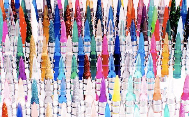 Of Polish Jewish origin, born in Paris, and currently residing in Johannesburg, South Africa, Ronit Judelman (a clinical psychologist and second-generation Holocaust survivor in addition to being an artist) focuses on the paradoxical nature of society and specifically as it pertains to the horrors of war. In her series Weapons of Mass Destruction: Games People Play, Judelman juxtaposes toys with weapons “to highlight the paradox of using war to achieve peace [she] combined children’s toys, which stand for safety, innocence and fun, with adult weapons, which symbolize aggression, deviance and cruelty.” As a result, the works are a bit unsettling and quite powerful.