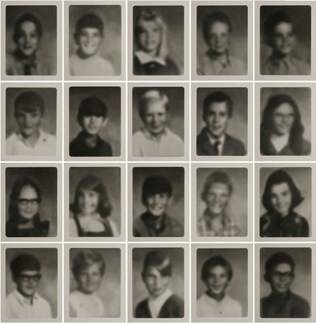 At first glance, I thought I was looking at a wall of blurred old yearbook photos, which in itself held some interest, but when I realized that these were in fact pencil drawings, well, I was completely awestruck. I had such a hard time believing it that I kept asking the gallery representative if she was sure that they were all pencil drawings. Surely some were photoshopped images. Maybe she had misunderstood. Maybe I had misunderstood. No. These small-sized (the largest are postcard size), hyper-realistic portraits and group photos are all drawn by hand by artist Paul Chiappe of Edinburgh, Scotland. It would be impressive enough if these were in focus, but to be able to render the blurred aspect takes it to the next level.