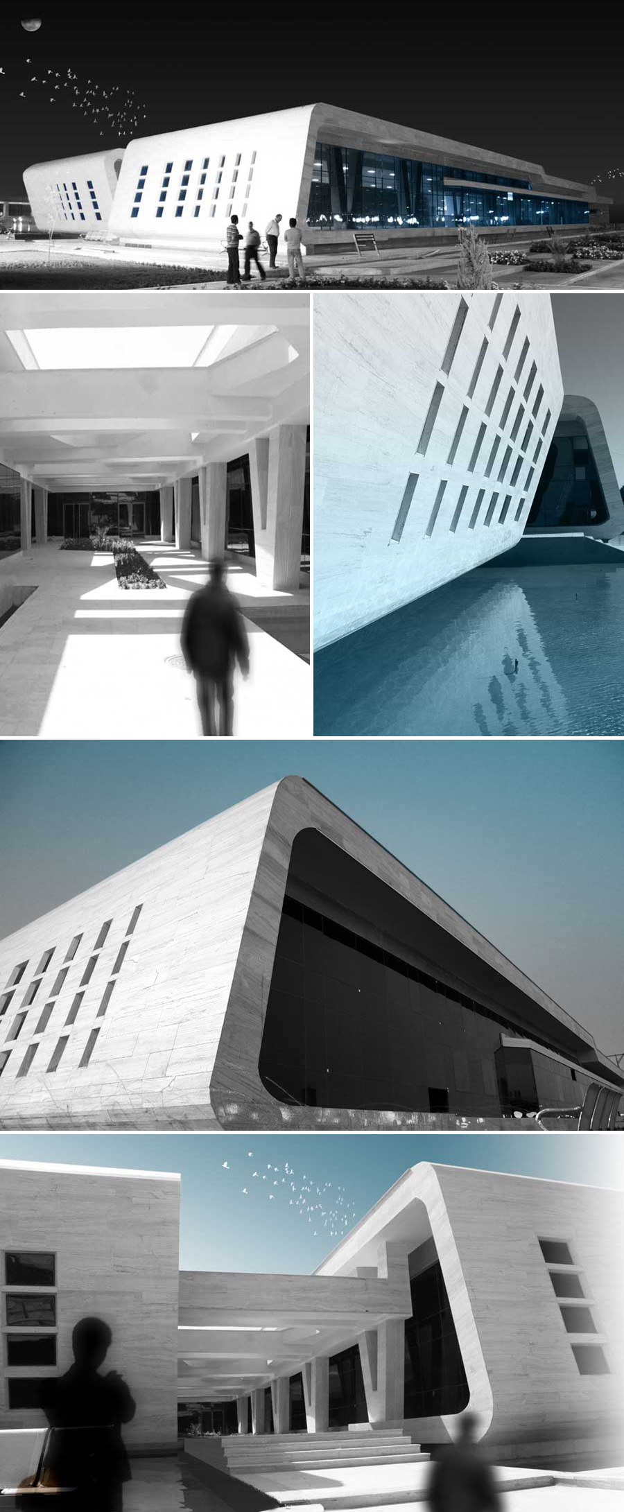 Located in Zahedan, Iran, as part of the Sistan & Baluchestan University, this restaurant, designed by Lida Almassian and Shahin Heidari of New Wave Architecture, has a dramatic folded skin that works beautifully sitting over the water. By breaking the mass into two volumes, the architects were able to make the building communicate nicely with the surrounding landscape.