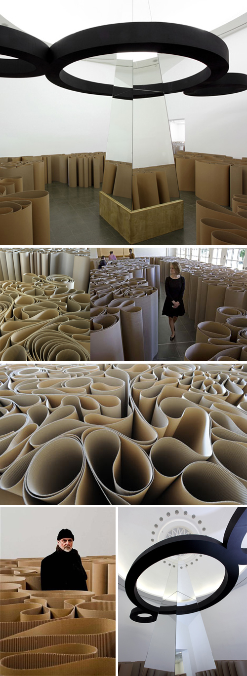 A leading figure in conceptual art, Italian artist Michelangelo Pistoletto has combined several elements from previous works to create the site-specific installation The Mirror of Judgment at the Serpentine Gallery in London. In the labyrinth of corrugated cardboard one comes upon sculptures/objects that include a Trumpet of Judgement, a Buddha, and a prayer kneeler, to name a few. Pistoletto says the gallery is like a temple – in a spiritual sense, not religious – where we come up against the mirror and are meant to judge ourselves.