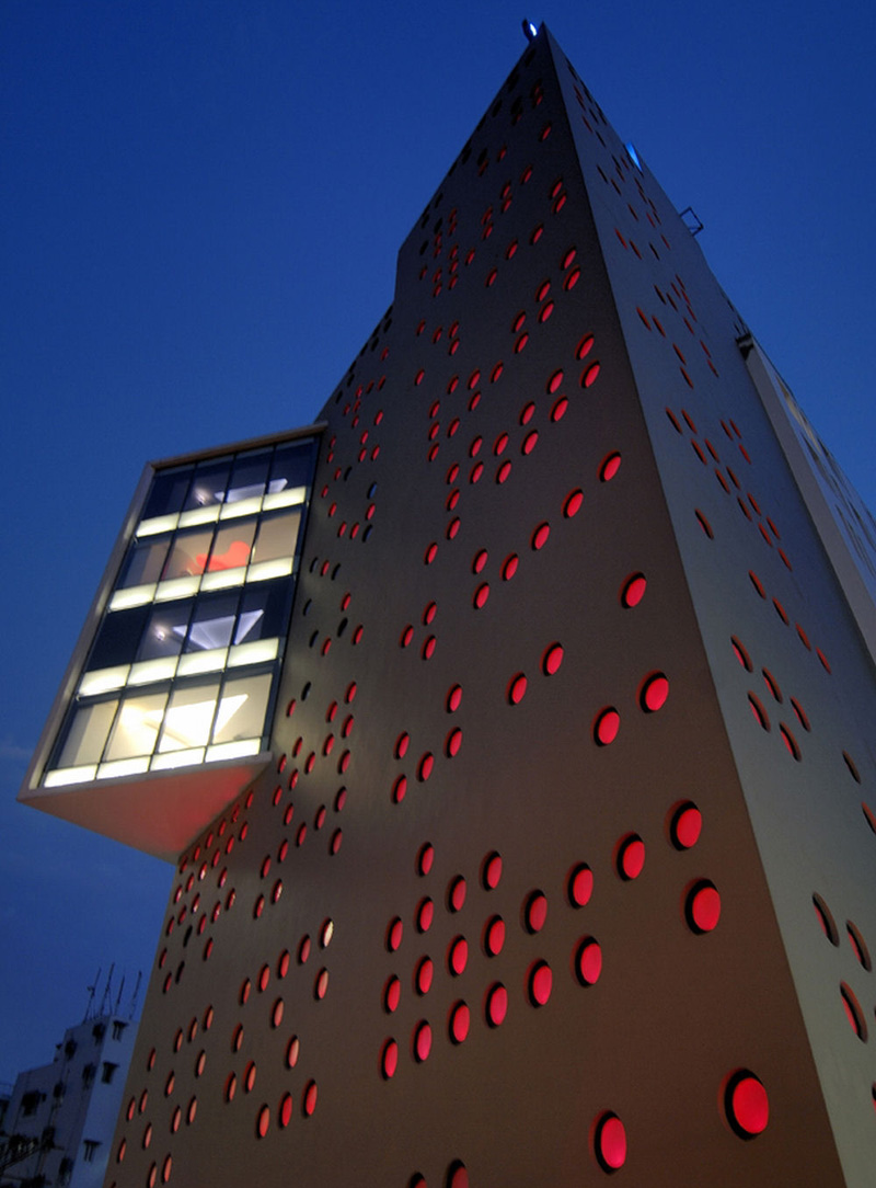 Continuing with Sanjay Puri Architects (I told you I liked their work), the Chrome Hotel in Kolkatta, India looks like a hotel I’d enjoy checking out if I were to be in Kolkatta one day. The circular cutout windows in the skin are arranged in a graphic pattern and are deliberately created in an opaque glass to allow the interior public spaces to have an ambiance of their own, allowing only the light to come through and not the view. In addition, the windows are shaded by concrete fins that surround them which offers privacy as well as acting as a heat barrier, reducing the amount of air conditioning necessary to cool the hotel by a quarter.