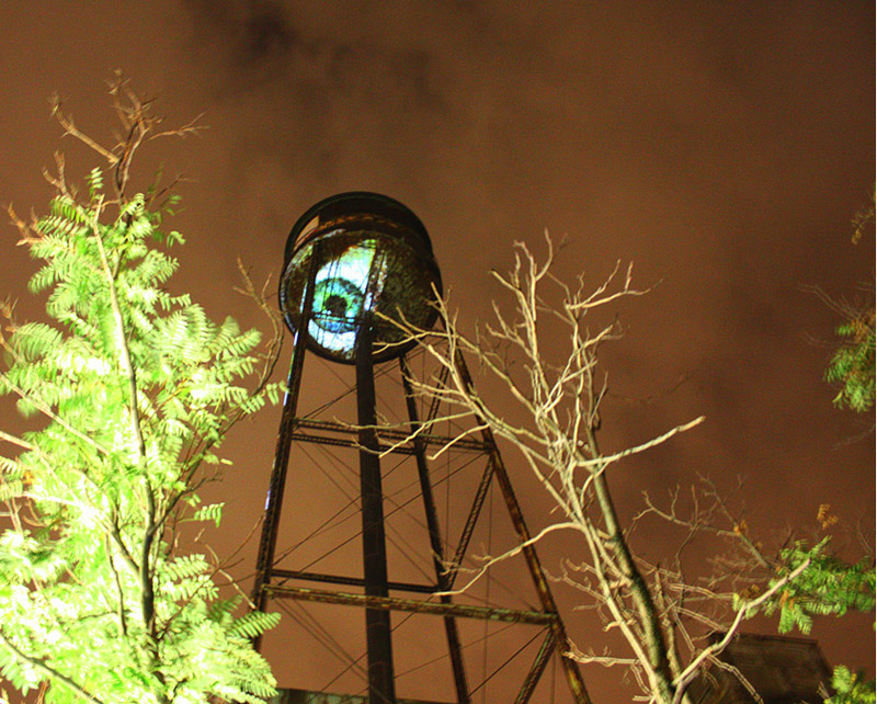 Marcus Zotes-Lopez’s CCTV/Creative Control TV; a projection of an eye on the bottom of a water tower looking over the crowds.