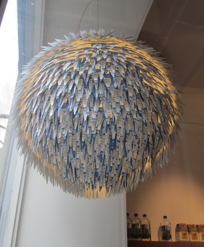 A couple of days ago, on a nice stroll up from Canal Street, a friend and I spotted an interesting structure in the window of the very cute Lafayette Espresso Bar + Market. Going in to explore further, and have a tea while at it, turns out the large sea urchin-like object was a lamp made from 300 of the classic “It’s Our Pleasure to Serve You” coffee cups, cut into slim triangles. The artist/designer behind the lamp? The multi-talented Christian DuCharme. Previously a set designer and window display artist, the Swiss designer from Zurich now works as an interior and accessories designer. And, well, he also makes lamps. Very cool ones at that.