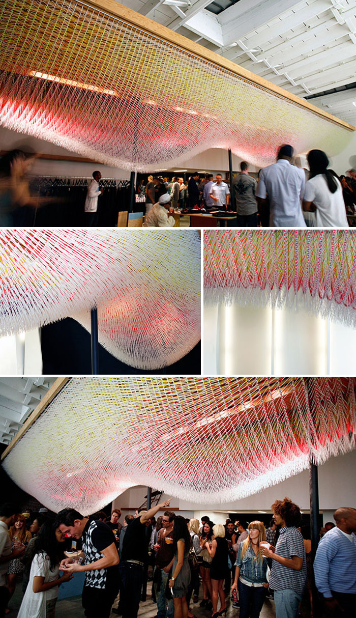 The earlier installation (bottom images) Life Will Kill You was installed temporarily at the Revolve Clothing showroom in West Hollywood. The cloud-like piece was created using over 100,000 zip ties with the exterior surface composed of longer white zip ties, and the interior levels of shorter colored ones, resulting in a richly textured effect.