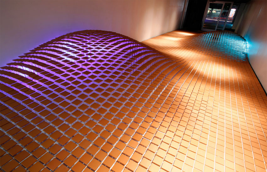 Within the past year they have put that belief into action with two very cool installations in L.A. California: Stay Down Champion, Stay Down and Life Will Kill You. Stay Down Champion, Stay Down (photos at top) was installed at the Woodbury University Hollywood Gallery. Focusing on the ground plane, the piece was comprised of terracotta tiles creating a flowing and colorful interior landscape with bulging areas elevated by transparent acrylic supports highlighted by vibrantly colored lighting.