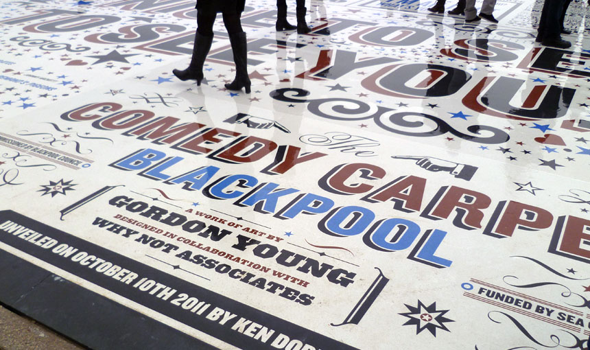 The Comedy Carpet in Blackpool – a seaside resort town in the Northwest of England – is a typographic celebration of comedy in a grand way. The 2,200 sq. meter installation contains over 160,000 granite letters embedded into concrete, making it virtually impossible not to tip toe through the type.