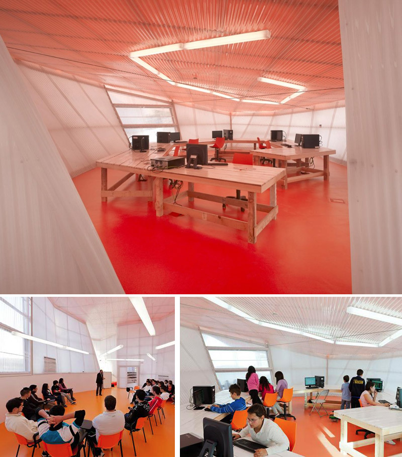 SelgasCano Architects’ design for the new Youth Factory (Factoría Joven) in Mérida, Spain is all about welcoming and protecting. The colorful youth center is very open with its, possibly, most notable feature being a huge orange, organically shaped canopy that protects from rain and the strong hot rays of the sun, typical of Mérida. The architects refer to this prominent aspect as a plastic ‘cloud’.