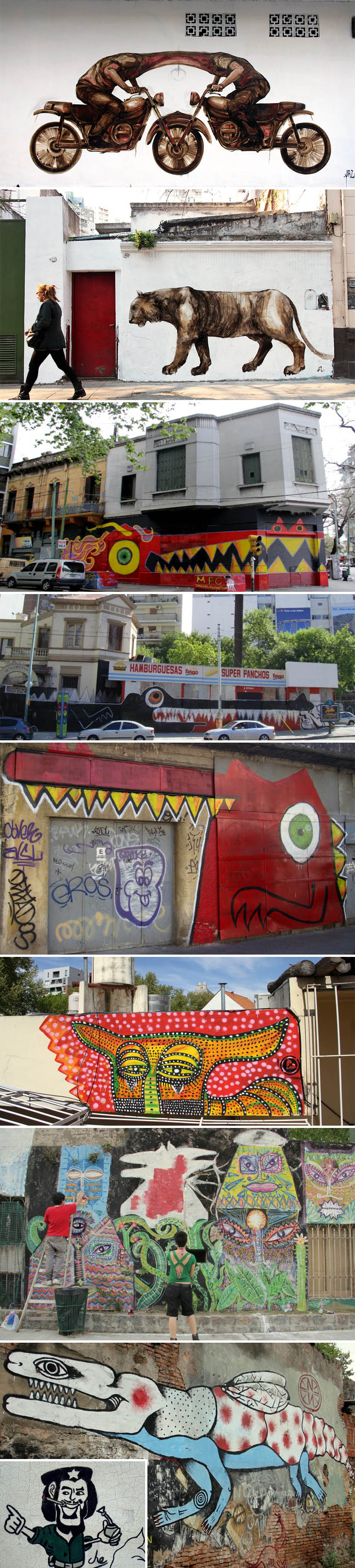 From top to bottom: Top three images from Jaz in super-economical asphalt paint. Next three images from MPC crocodiles around BA; Mural by Bixo; Wall mural by Malegria; Bottom mural by Ene Ene; Che with mate artist unidentified.