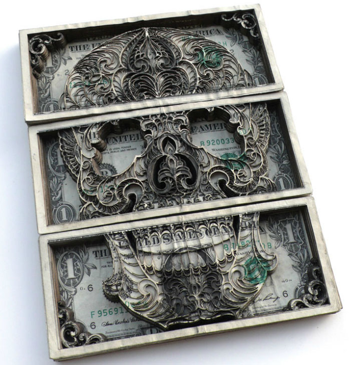 In Campbell’s cut currency works, he sources uncut sheets of dollars directly from the U.S. Mint and creates intricate sculpture-like pieces with a sunken relief effect by laser cutting the stacks of bills.