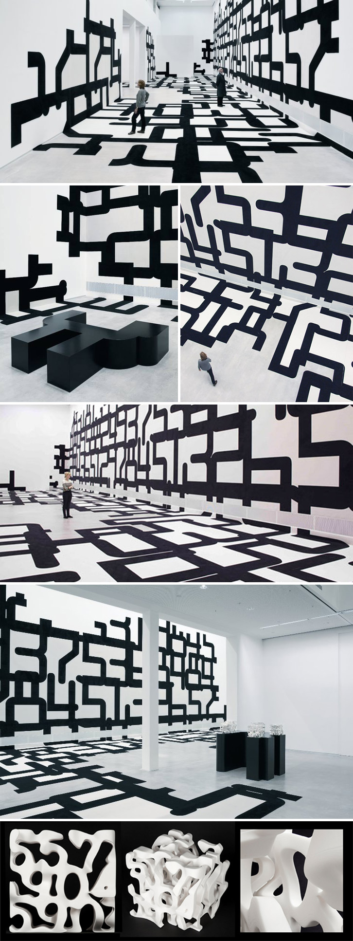 The German architectural firm J. MAYER H., founded by Juergen Mayer H., has designed an installation for the Berlinische Galerie titled Rapport: Experiments with Spatial Structure. Data security patterns have been printed in an unimaginably large point size on carpeting which adorns both the floor and walls of the museum’s 10-meter high entrance hall. The large, somewhat abstract shapes created by the oversized numbers, results in a flickering impression and transforms the rigid white cube into a playful scenario negating its strict geometry.