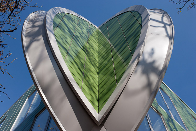 The new Maggie’s Cancer Caring Center in Nottingham, England, was designed by Piers Gough, Partner CZWG Architects with interiors by Paul Smith. Comprised of four interlocking ovals and elevated above the ground to give a floating sensation, the distinctive building is clad in green glazed ceramic tile.