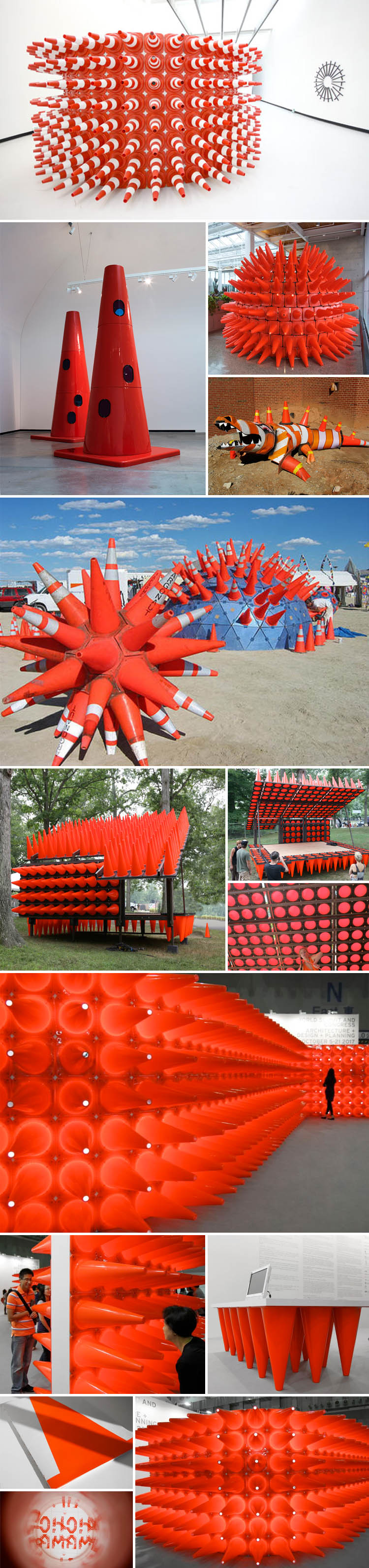 In the past month I’ve come across a few works made of traffic cones, so I decided to explore more and see what else is out there. Here are some of my favorites; from installations and sculptures to traffic cone inspired graphic design.