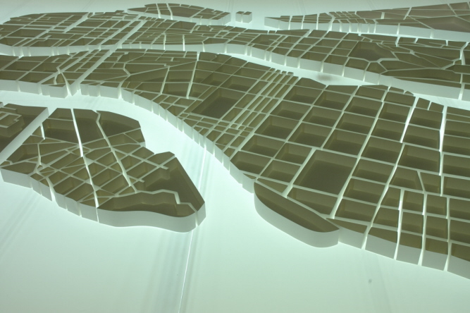 Picton’s earlier city map sculptures are mostly made from duralar, enamel paint, and pins with several layers depicting streets and roads at the micro level in addition to the city’s evolution over time. Each layer showing a layer of history in the city’s transformation. Beautiful on “multiple levels”: cartographically, artistically, and textually.