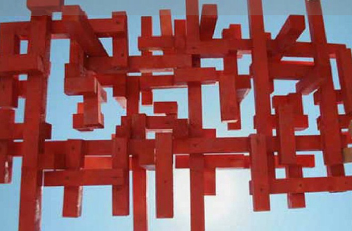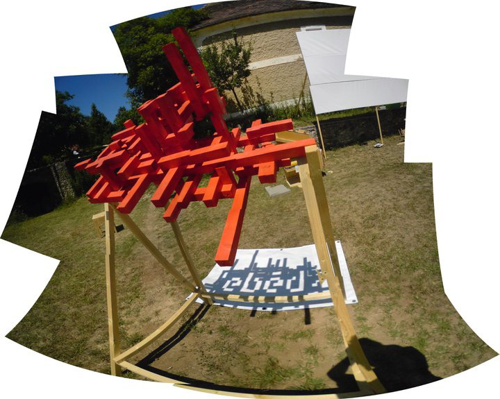 What appears to be an abstract wood sculpture made up of a cluster of two-by-fours painted red, is exactly that for 23 hours out of the day. The sculpture, created as part of the Hello Wood Festival in Budapest this past July, was one of the three “typography team” projects (there were architecture teams and film teams too) made by students from Hungarian Universities. Titled Ebéd (‘lunch’ in Hungarian), this structure was designed to form the word ‘ebéd’ in a pixelated font, using the rays of the sun to highlight it in the negative space of the shadow precisely at 1pm: lunchtime! The rest of the day the sculpture showed a random system of shadows. Very clever, I’d say.