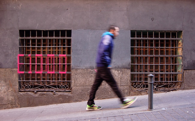 Spanish street artist E1000, (previously here), has taken to tagging the streets of Madrid in a cryptic manner, taking advantage of the horizontal and vertical lines of gates, grates, shutters, vents, and manhole covers to paint the five characters of his signature. Guillermo de la Madrid has found, photographed and documented a bunch of them on his blog Escrito en la Pared. Above are most of them.