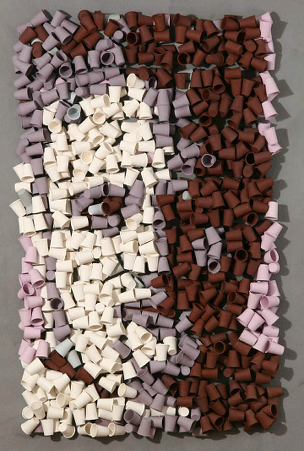 Though considered a sculptor, many of Hake’s sculptures hang in the same way two dimensional art typically does. Included here are portraits made up of cups, photos, balls, light bulbs and, not a portrait but, a volcano made of building blocks. Cool stuff.