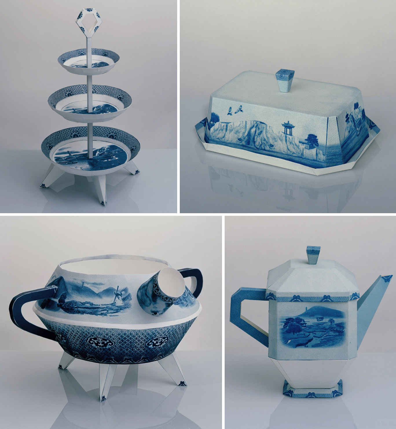 Look closely at these paper dishes. Malaysian artist Fan Chon Hoo, who studied and, I believe, lives in London, is interested in the process of cultural translation within the context of postcolonialism. In his series of works titled The Blue and White Collection, Chon Hoo responds to the traditional English Willow Pattern from the late eighteenth century by creating a set of paper earthenware printed with cyanotype imaginary landscapes using Asian architectural structures found in the UK.