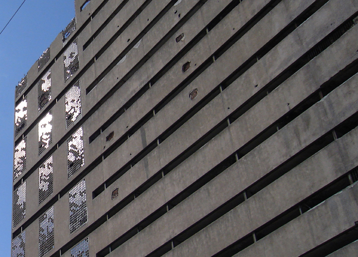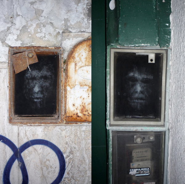 Also very interesting are his works on the streets of Buenos Aires. The photo second from bottom, are two small Animas embedded in a building front, and the bottom photo is from his work 16 Tons, using the prison window grids of a Buenos Aires prison as a pixelated screen. By breaking out certain windows, images of faces appeared reflected in the remaining panes. Very cool and creepy.