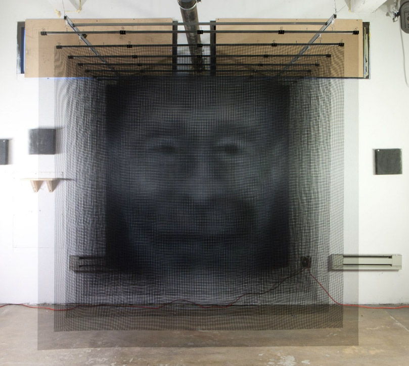 I saw one of Seth Wulsin’s Animas installations a few years ago in his studio as part of the Dumbo Arts Festival in Brooklyn. I was very impressed at seeing these large-scale screens hanging from the ceiling that individually just looked like plain screens, but when seen all together from the front, an almost holographic, three-dimensional, ghost-like head would appear floating on the screens.