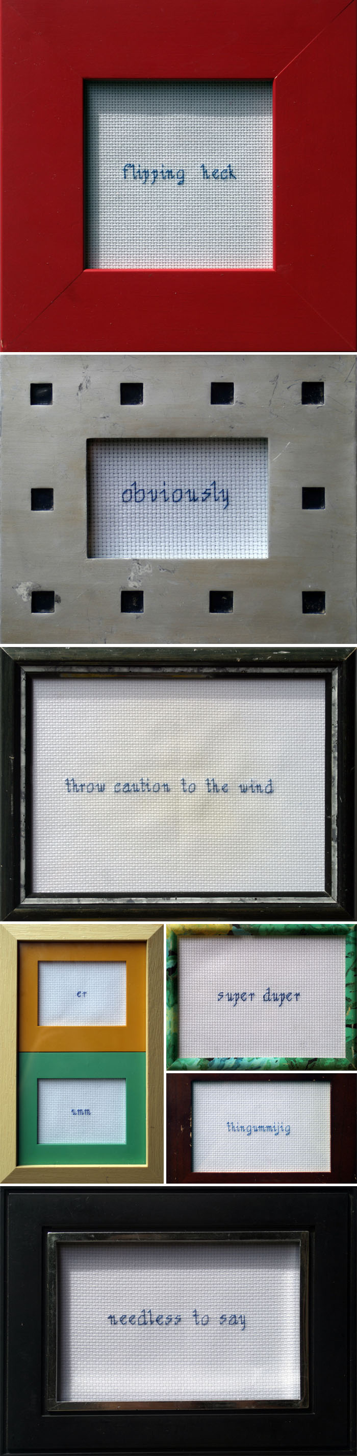 I happened upon Lisa Bowen’s delightful tumblr of embroidered clichés and expressions, which made me chuckle. Originally from England but now living near Sydney, Australia, Bowen (who also goes by the alias Jilly Cooper) a mixed media artist has recently started a crafty, cross-stitch series titled ‘How to String a Sentence Together.’