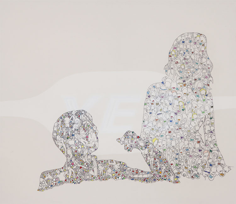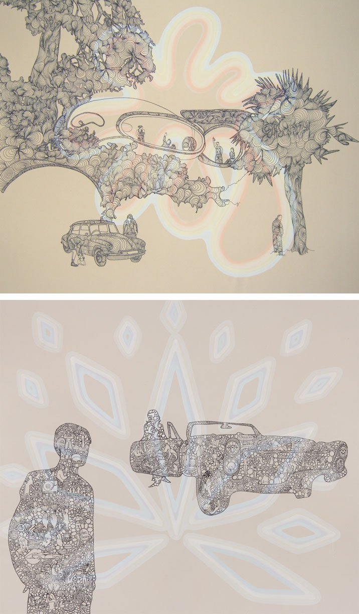 There’s a lot to look at in these paintings by Jonny Detiger. They’ve got a doodle-y quality that I like mixed in with a 70s vibe. The names of Detiger’s current solo show, as well as his previous one, seem to describe his art perfectly: Stream of Conciousness and Kaliedoscopic Adventures.