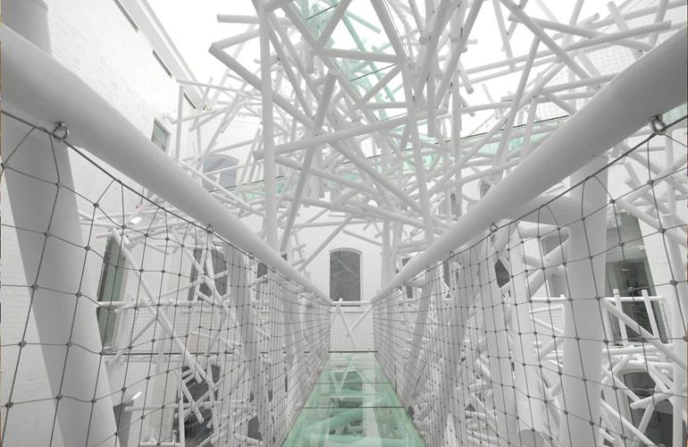 This really caught my eye. In the center atrium of Zellig — a building designed to provide space for young creative enterprises and galleries as part of the Custard Factory redevelopment in Birmingham, England — is a unique five-story-high sculpture designed by Philip Watts Design titled Chaos. Though at first glance the piece does give the appearance of a chaotic mass, in actuality it is a functional art installation designed to connect the courtyard at three levels. Made with 2000 meters of steel tubing and containing three glass bridges, it must be quite spectacular to find oneself intertwined in the sculpture.