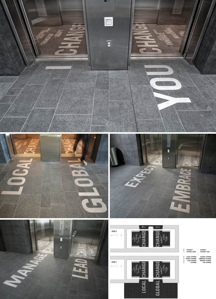 As the elevator moves from floor to floor, the interior word “change” is modified by another word just outside the elevator, to both the front and back: