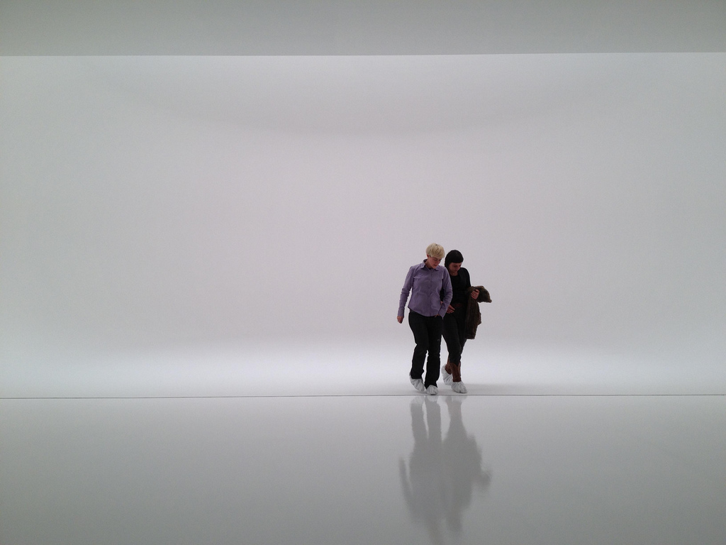 Now, back to the exhibit: Amazing. The bright white light installation is the closest thing to what, I imagine, standing in a cloud might feel like. The first impression is that of a flat wall created by light. As one reluctantly steps forward—wearing the white booties provided by the gallery to keep things pristine—it feels as though you’re stepping into the void. The minute the light box is entered, all depth perception disappears. There’s a dense fog-like effect that’s created with light and white paint. The walls have been curved and the lack of hard lines or horizon intensifies the confusing sensation. The result is at first a little unsettling, but the incredible coolness instantly follows. The light in the box fluctuates emulating the light of day, from dawn to dusk, in a 32-minute loop.