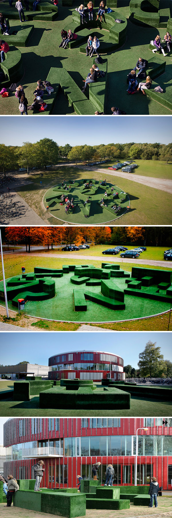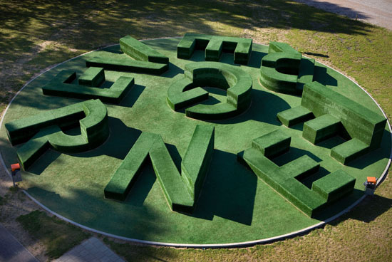 Evergreen is a permanent typographic sculptural installation that was designed for the new Twents Carmel College de Thij—a high school in Oldenzaal—to be used primarily as student seating and as a meeting place in a park-like setting. The large, multi-level letters spell out the word ‘Evergreen’ and are grouped in a way that makes the space resemble a labyrinth. The structure is covered with artificial turf and its circular shape echoes the shape of the school building itself.